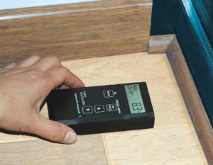 The photo (right) should show an easy to identify “landmark”: Here a corner with a low window sill and special moldings. The photo should show the moisture value and the meter settings if possible. It is also important to show the hand pressing the meter against the floor. (When taking a reading pinless meters should be pressed slightly against the surface.)