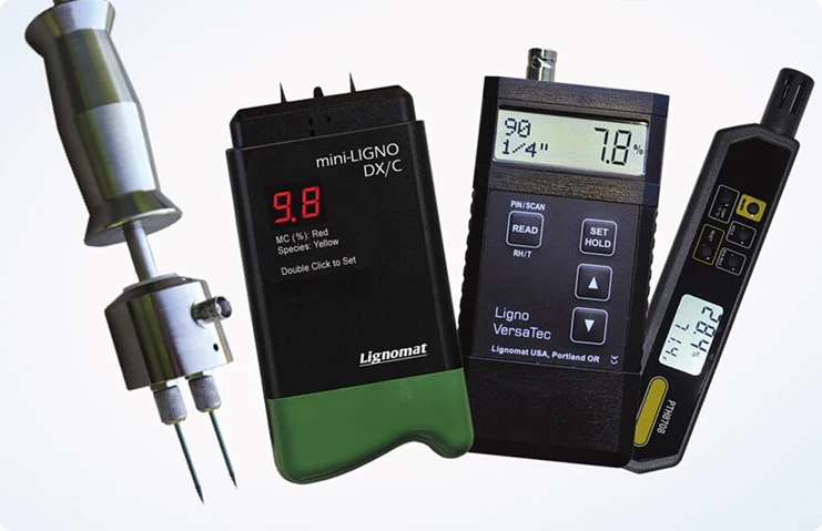 Moisture Meters and Thermo-Hygrometers help verify whether materials have the desired moisture content and are in an equilibrium with the surrounding air. Meters like the Ligno-VersaTec or the Ligno-DuoTec BW can test both moisture and humidity.