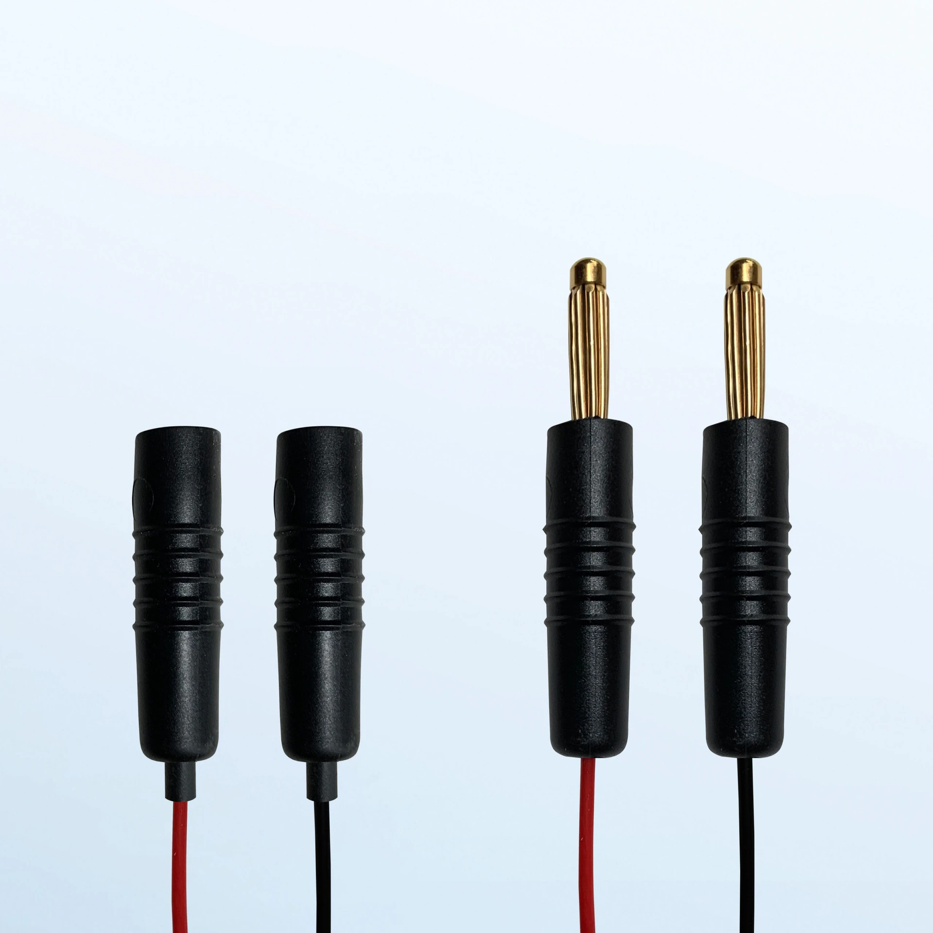 The E-H cable has two 4mm banana plugs on one end and two 4mm jacks (sockets) on the other end.