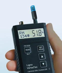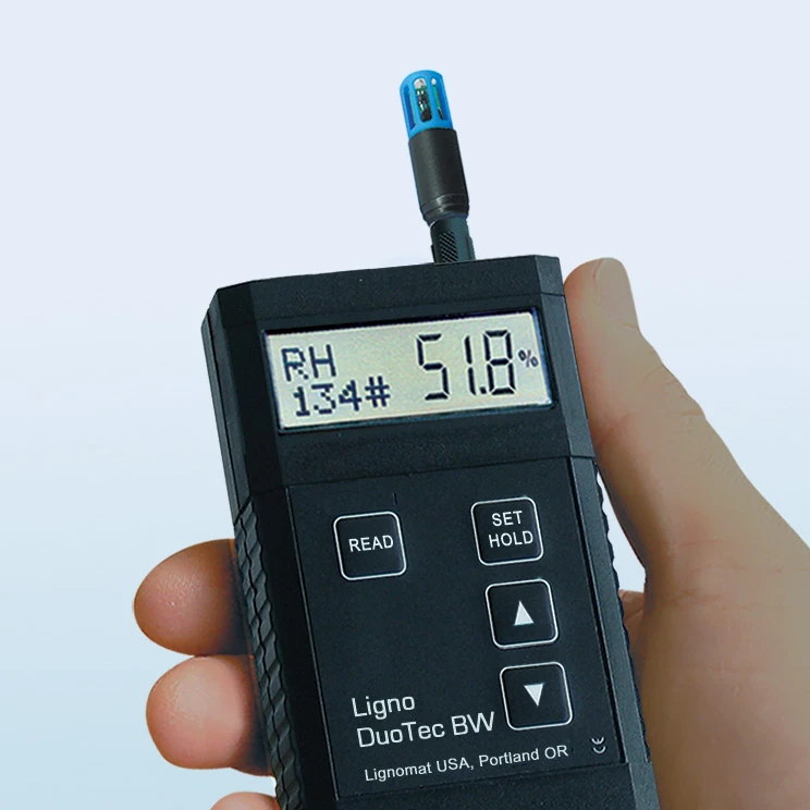 Measuring relative humidity: The Ligno-DuoTec meter functions as an RH meter or a thermo-hygrometer, when the RH BluePeg probe is connected. The RH BluePeg probe uses a single micro-chip sensing element, factory calibrated to NIST standard. The sensing elements were chosen for their precision and fast response time.