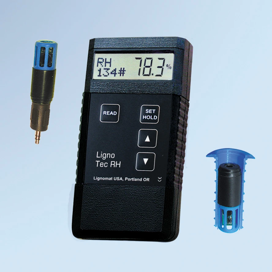 The Ligno-Tec RH meter functions as an RH meter or a thermo-hygrometer, when the RH BluePeg probe is connected. The RH BluePeg probe uses a single micro-chip sensing element, factory calibrated to NIST standard. The sensing elements were chosen for their precision and fast response time.