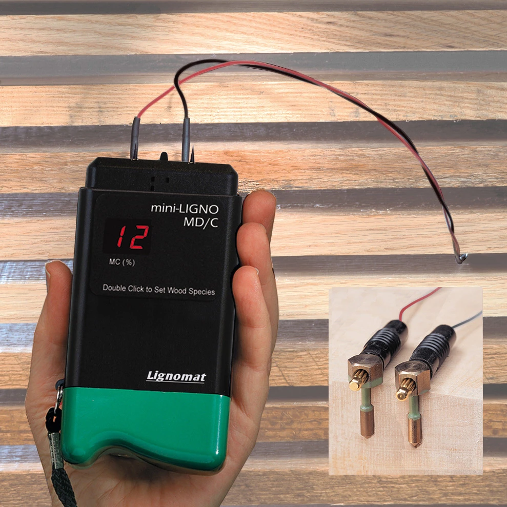 The integral pins at the mini-Lignos measure 7/16″ deep. The meter indicates the highest moisture content along the pins, which could be surface moisture or moisture more towards the core. If the places you want to measure are hard to reach with the integral pins of the meter, you can add attachments to the following mini-Ligno C models: