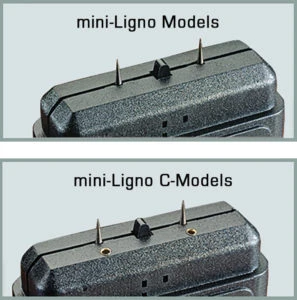 Lignomat offers mini-Ligno moisture meters in two variations. The standard mini-Ligno model is equipped with built in pins for handheld moisture measurements. mini-Ligno C-Models come with built in pins as well as connectors for use with external cables and electrodes.