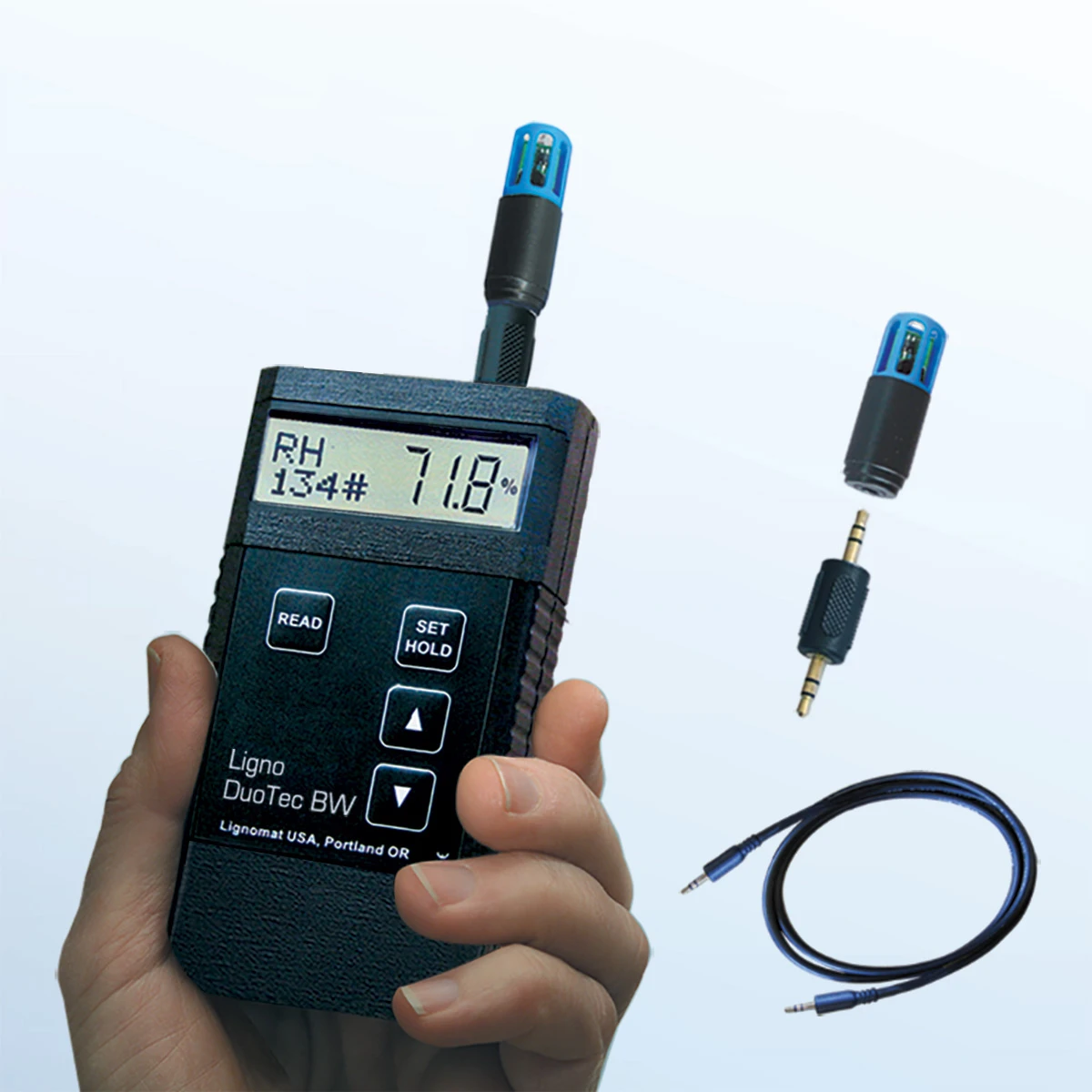 The Ligno-DuoTec BW is a dual-depth, pinless meter and a thermo-hygrometer. It has a wide measuring range with 90 correction settings for measuring domestic and tropical wood species, bamboo, subfloors and engineered flooring products, gypsum and different types of wall boards. Relative scales are included for concrete (ASTM F2659), cementitious materials and different types of panel products