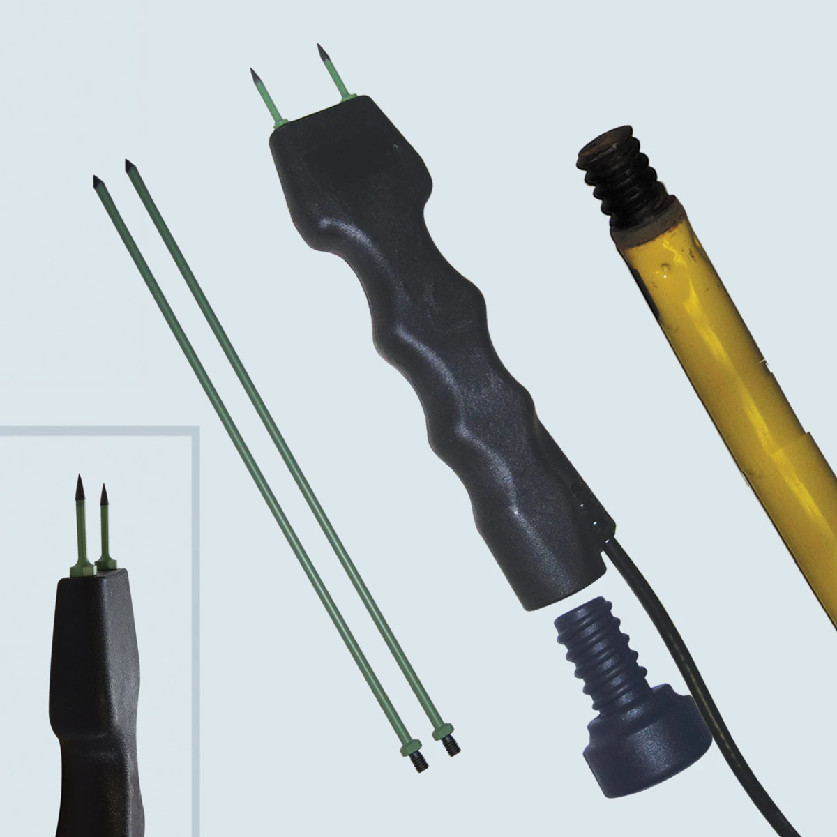 Electrode E14-V can be used for measuring moisture on any surface up to 3/4″ deep with insulated pins EG. In addition, the slim shape of the E14 allows checking tight places, around pipes, below window sills, in wall corners, places which cannot be reached easily with other hand probes. If the pins are hammered into the material, consecutive readings show moisture changes within the material at every depth level the pins are driven to. Adding the 7″ long EL pins lets you reach through insulation or under