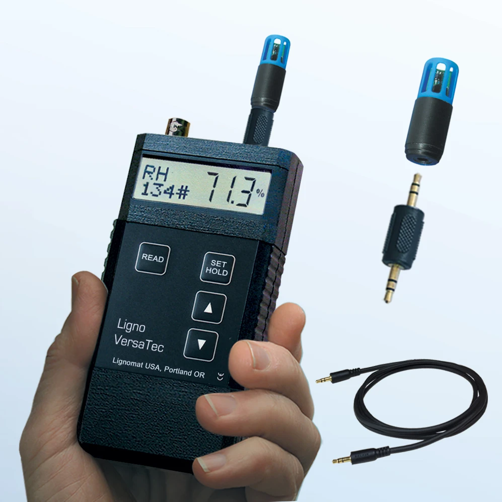 The Ligno-VersaTec is the most advanced meter among Lignomat’s moisture meters for pin-pinless-RH measurements. Features are the wide moisture range and more than 150 correction settings for measuring domestic and tropical wood species, OSB and other panel products, bamboo, gypsum and different types of wall boards. Relative scales are included for concrete, cementitious materials, plastics, insulation…
