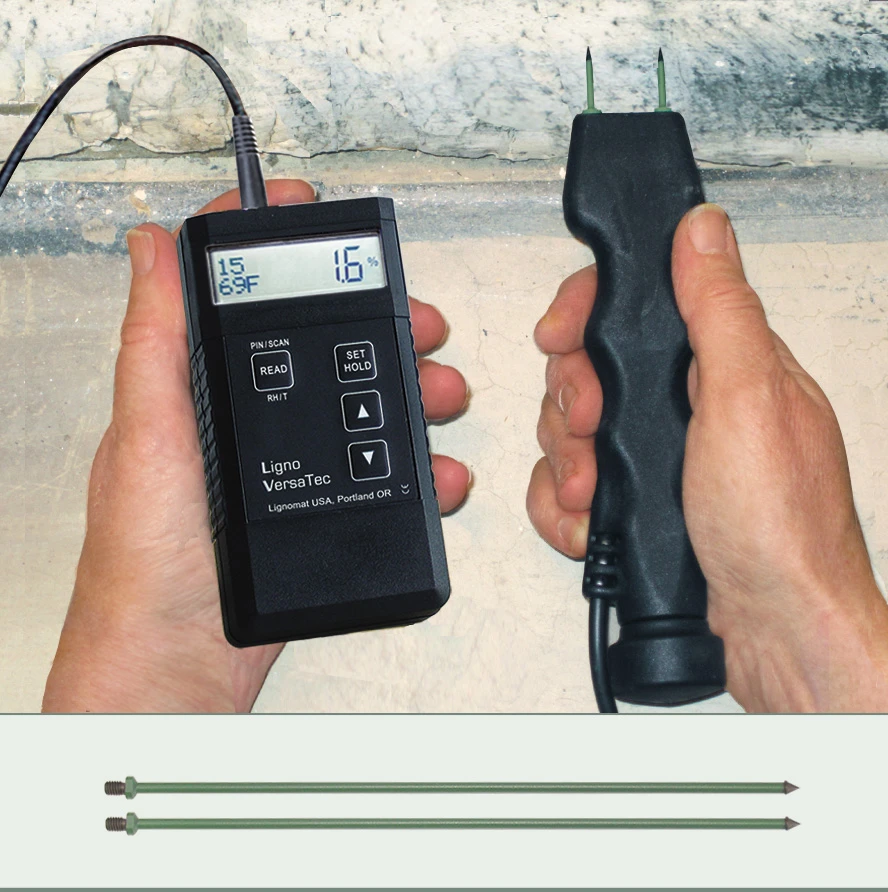 The Ligno-VersaTec meter by itself allows fast and easy moisture testing of flat surfaces 1/4″ and 3/4″ deep. Percent values are indicated for all wood species, OSB and other panel products, engineered floors, bamboo and drywall. Relative scales are for all other materials including concrete. Comparative readings can be obtained for all other moisture sensitive materials. Concrete can be measured in scan mode on setting #25 following ASTM 2659.