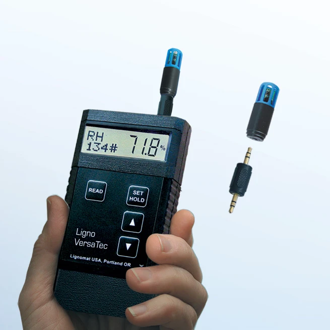 The Ligno-VersaTec is the most advanced meter among Lignomat’s pin-pinless-RH moisture meters. Features are the wide moisture range and more than 170 correction settings for measuring domestic and tropical wood species, OSB and other panel products, bamboo, gypsum and different types of wall boards. Relative scales are included for concrete, cementitious materials, plastics, insulation…