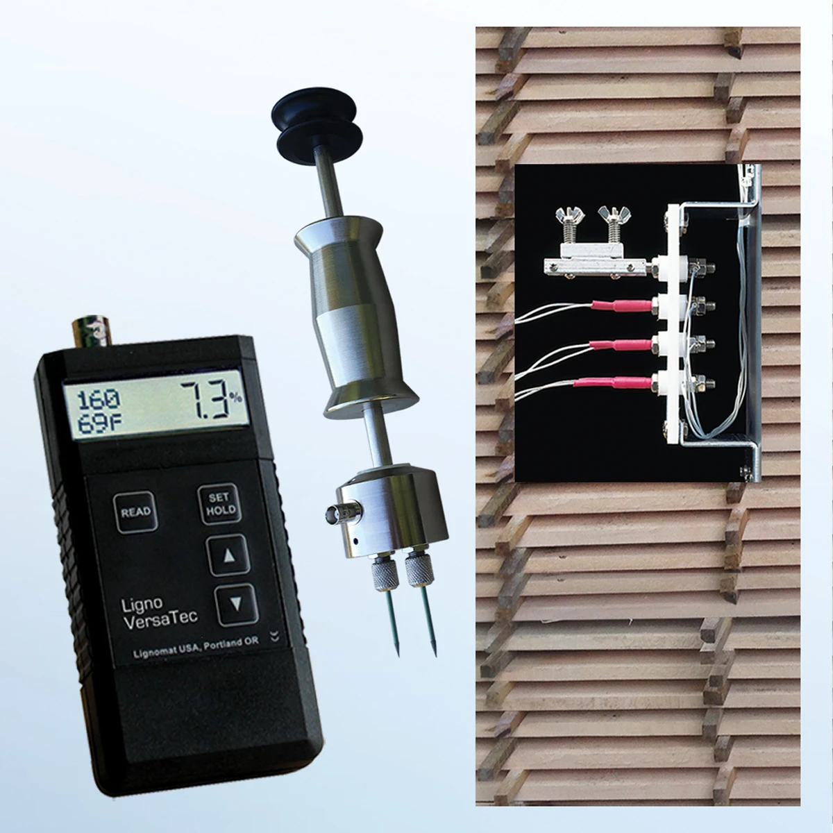 The V2-33M package includes the Ligno-VersaTec moisture meter, PK wood probes, PK-H cables, EMC station, station-plate and switchbox for monitoring moisture in a kiln. Besides using the wood probe/cables to monitor, pinless and pin mode can be used for on-the-spot measurements.