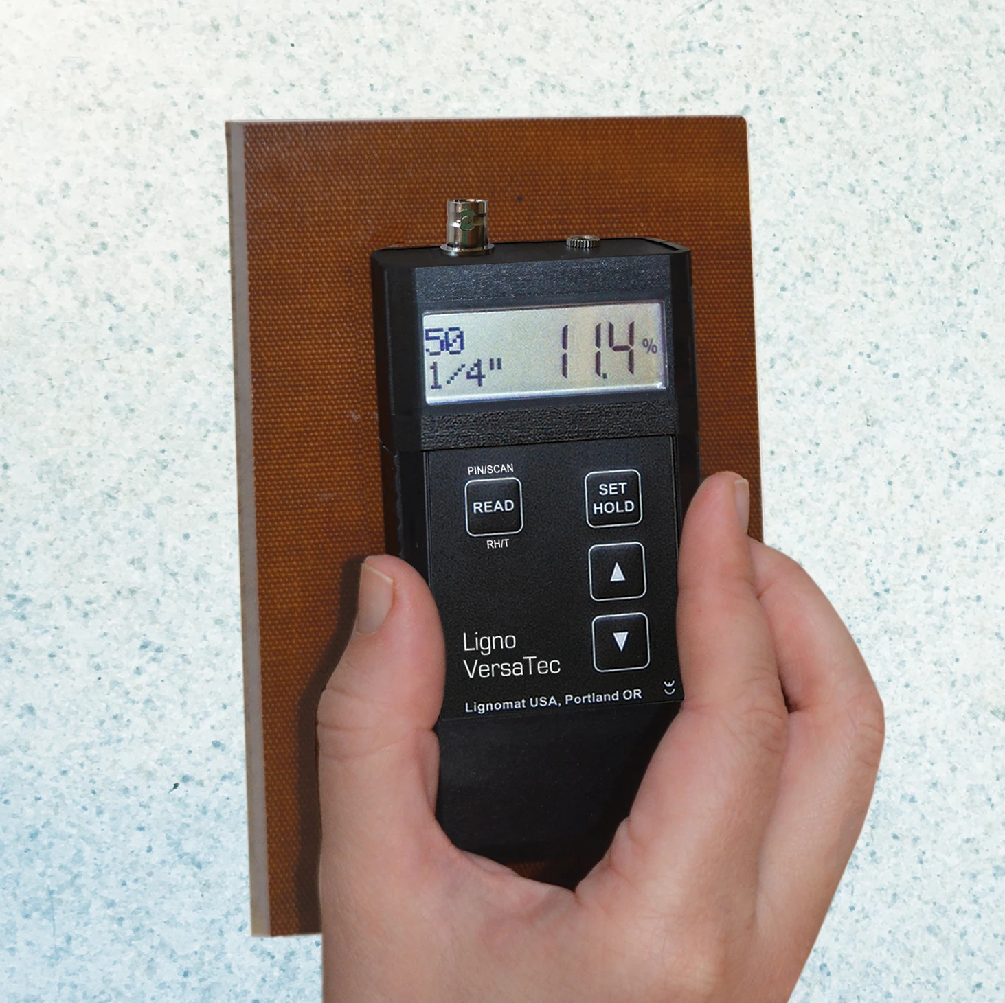 The pinless test block consists of a selected material, which produces a certain value when taking a reading on setting number 50 for both settings 1/4″ and 3/4″ depth. The same block can be used to check the calibration of all Lignomat pinless meter, the Ligno-Scanners, the Ligno-DuoTec BW and the Ligno-VersaTec.  The blocks vary in the moisture value they indicate. But the same block gives the same value for all Lignomat pinless meters. The correct value is printed on the back of each block. The permissible range is +/-1%.
