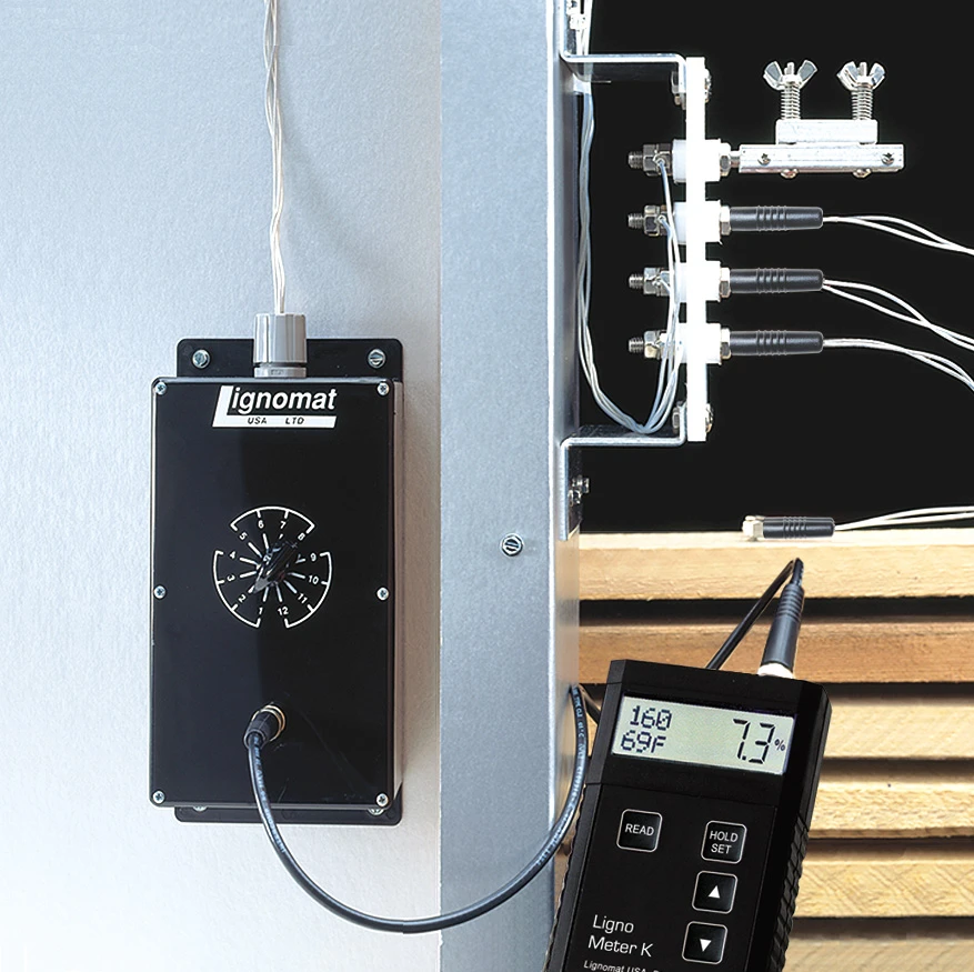 Now at any time, the Lignometer K or Ligno-VersaTec meter can be connected to the switch box with the standard BNC cable supplied with every Lignometer K or Ligno-VersaTec. Dialing from 1-4 or 1-12 positions will give individual moisture measurements from all wood probes inside the kiln.