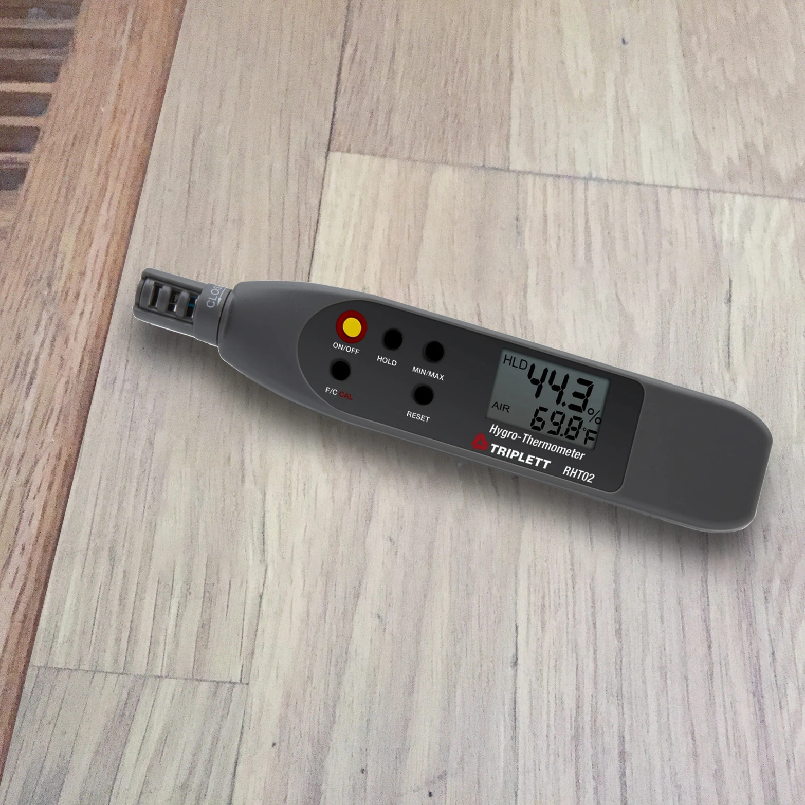 Operation is simple, push the on button and the meter indicates relative humidity and temperature values within a second. Display shows both RH in % and temperature in °F or °C. The PN has a fast response time, when the relative humidity changes. It takes a little longer to adjust, when the temperature changes and the meter itself is coming in being warmer or colder.