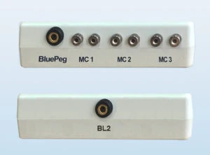 Three sets of 2mm jacks are for 3 cables with 2mm plugs coming from screws, probes or pins installed in the material for moisture measurements. One 3.5mm stereo jack on the left is for a RH cable or RH adapter to connect the RH BluePeg probe for relative humidity and temperature measurements.