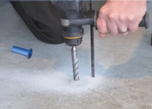 After all parts are on site, the number and location of the measuring points is established. Each hole is drilled with a 5/8” drill bit (Photo 4), cleaned and brushed out (Photo 5). Plus, the sleeve is inserted and the cap put in place before the next hole is drilled.